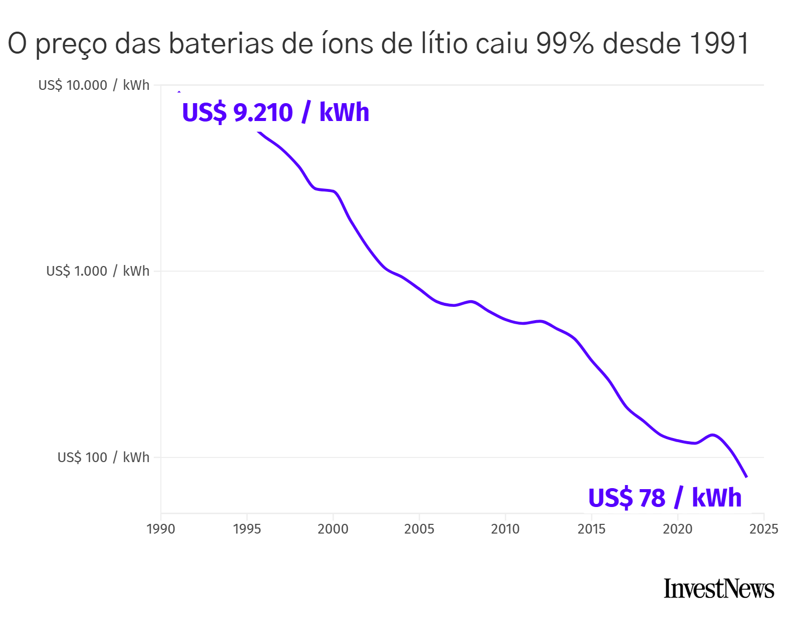 Hoje, as células de um EV custam uma fração disso: coisa de US$ 5 mil. Em média, o preço das baterias cai 19% cada vez que o volume de produção dobra.