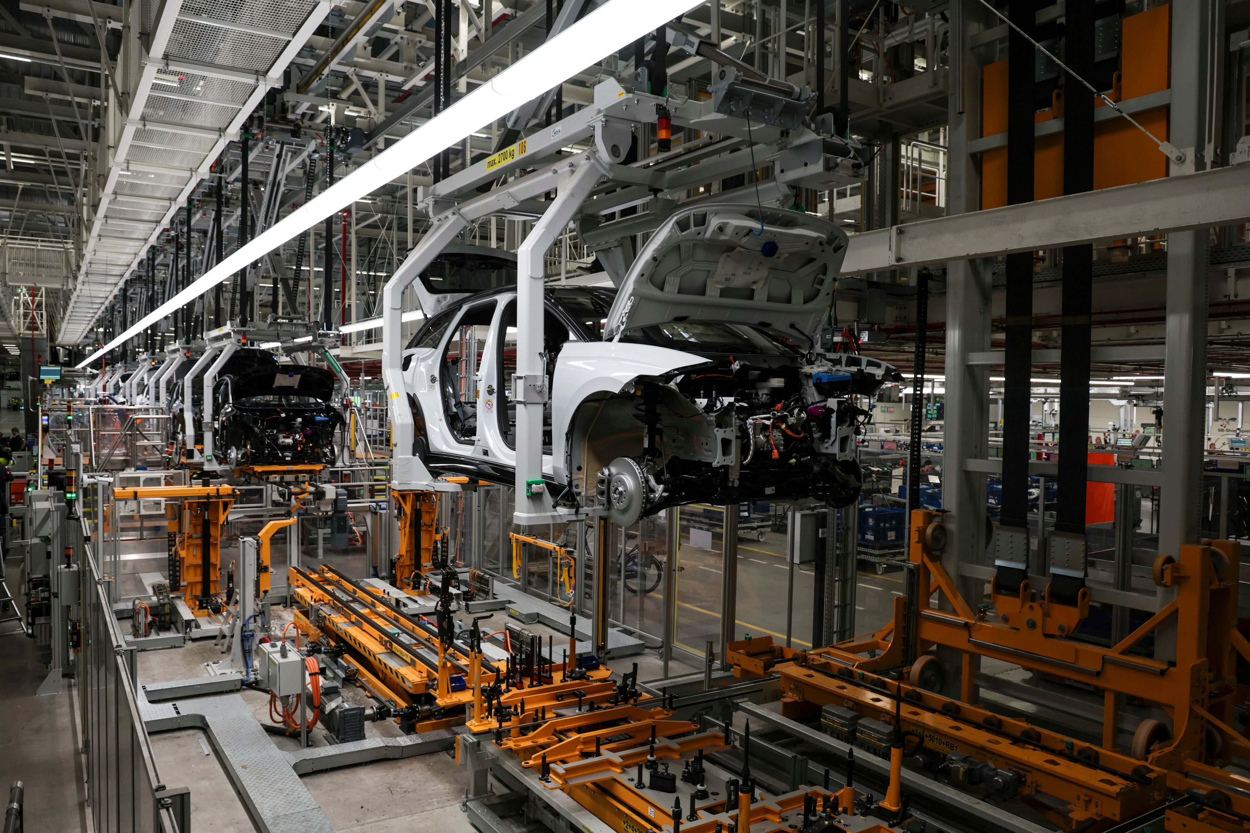 Na foto: Linha de montagem de carros elétricos da Volks na cidade de Emden, na Alemanha. Crédito: Focke Strangmann/Getty.