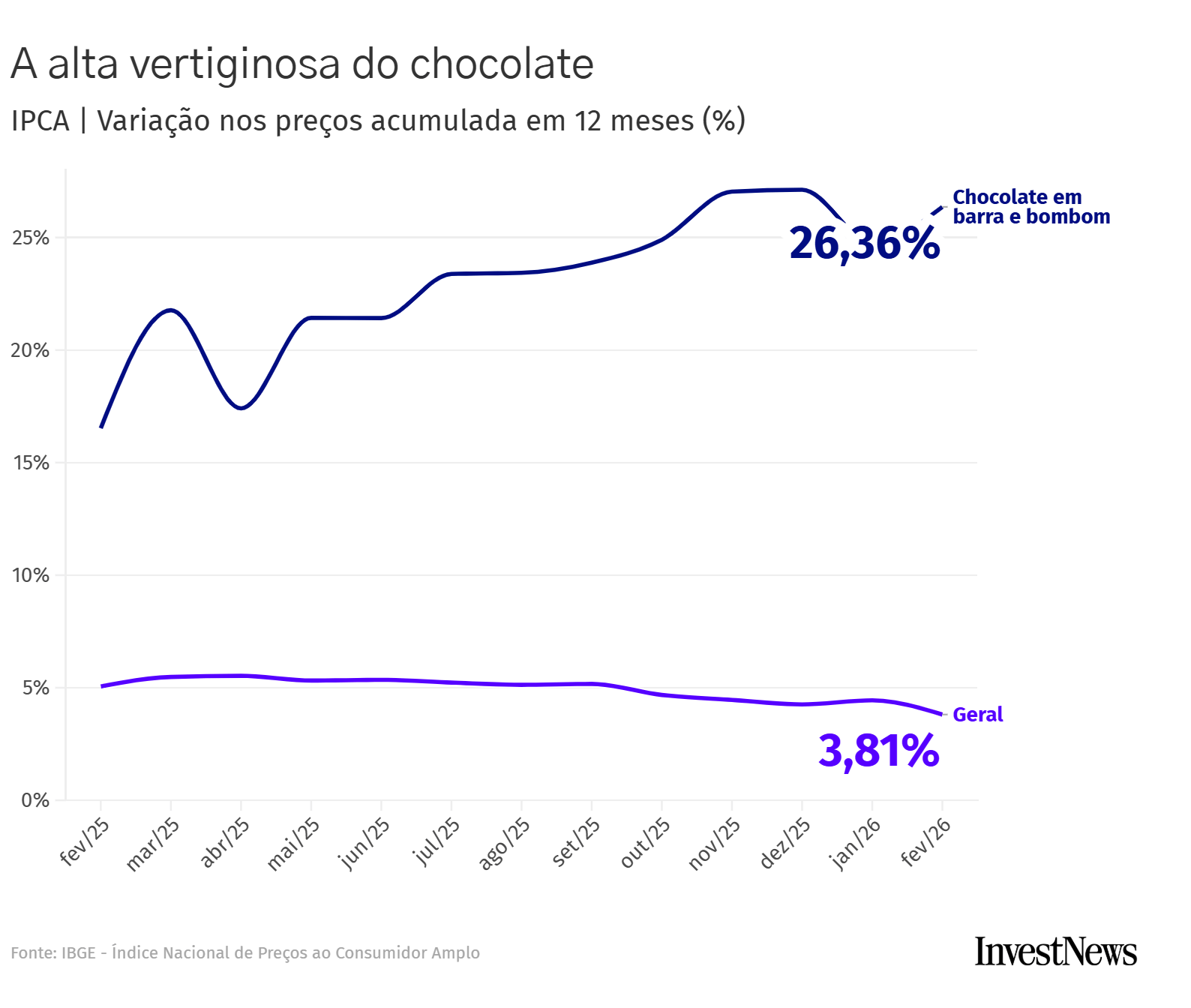 A Abras diz que a alta poderia ser maior não fosse o preço “meio amargo” do chocolate: a guloseima subiu 26% desde fevereiro do ano passado — bem acima da inflação geral, que está em 3,8%.