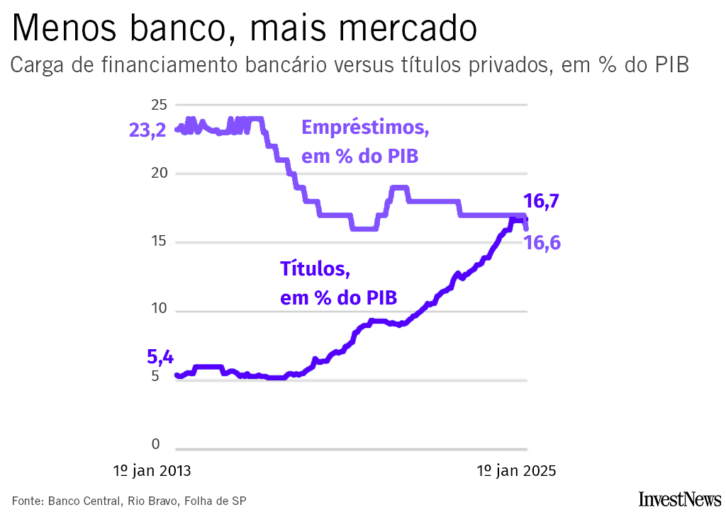 A diferença ainda está nos detalhes. Em junho, o volume de crédito dos bancos somava R$ 1,082 trilhão, o equivalente a 16,6% do PIB. Já o volume de títulos privados alcançou R$ 1,087 trilhão – ou 16,7% do PIB. Esse pacote inclui emissões de debêntures, CRIs, CRAs, FIDCs…
